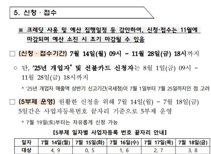 둘째, 신청 초기에는 5부제가 적용된다는 점도 체크하세요.사업자등록번호 끝자리에 따라 요일별로 신청이 가능하도록 제한되니, 혼잡한 초기 신청을 피하고 싶다면 해당 요일을 잘 맞춰서 들어가셔야 해요.