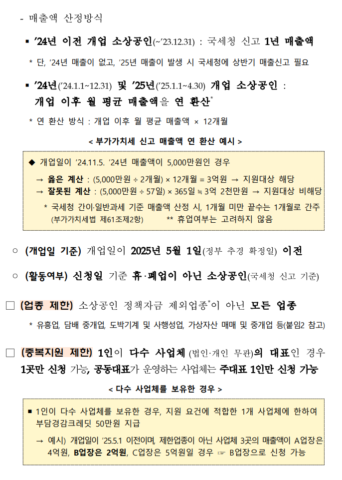 지원 대상: 2024 또는 2025년 매출 3억원 이하 소상공인