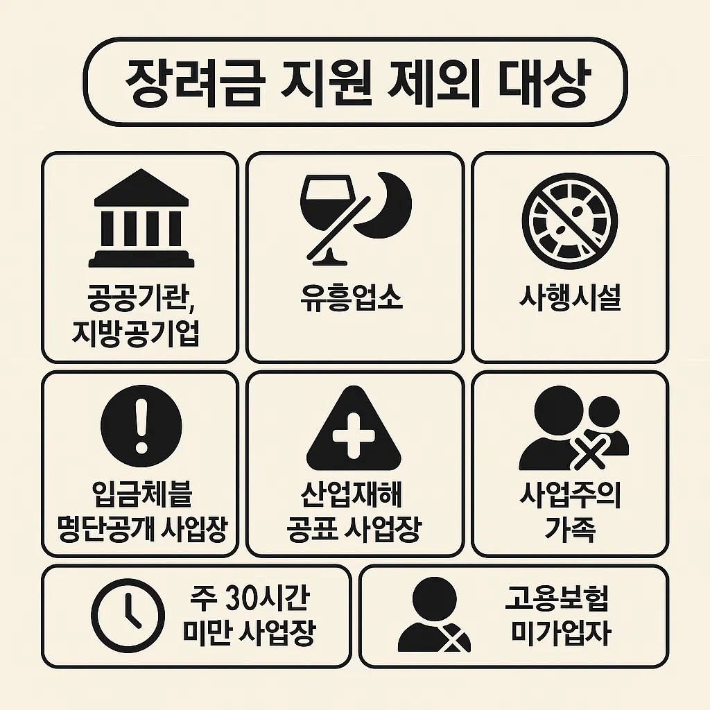 아무리 좋은 제도라 해도 모든 사업장이 다 받을 수 있는 건 아니에요. 정부는 몇 가지 예외 조항을 두어 부적절한 대상이 장려금을 받지 않도록 하고 있죠.