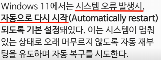윈도우 11의 기본 설정은 시스템 오류 발생 시 자동으로 재부팅되도록 되어 있어요. 처음에는 안정성을 위한 것 같지만, 실제로는 중요한 작업 도중 작업 중단 및 데이터 손실의 원인이 될 수 있습니다. 다음과 같이 설정을 바꿔보세요.