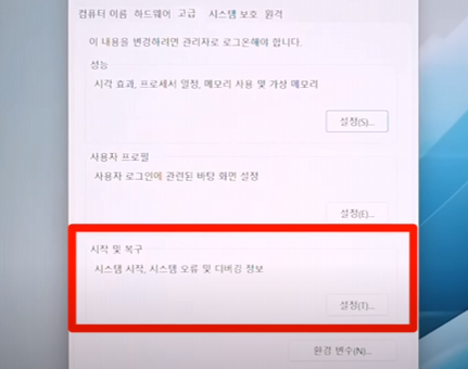 2. 팝업 창에서 [설정] → [시작 및 복구] 항목의 "설정" 버튼을 클릭합니다.