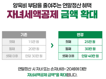 - 자녀세액공제: 1인당 15만 원을 공제하며, 2명은 30만 원, 3명 이상은 30만 원에 추가로 1명당 30만 원을 공제합니다