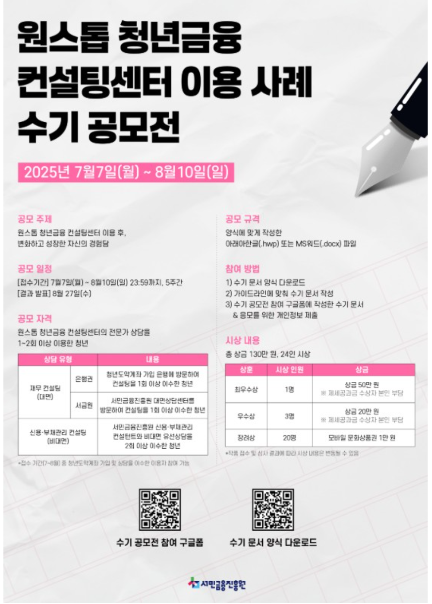 2025년 7월 7일부터 8월 10일까지 진행되는 이번 공모전은, 전문가 상담을 받은 청년이 자신의 변화와 성장을 이야기하는 내용을 주제로 합니다. 제출 방법은 간단해요! 서민금융진흥원 홈페이지에서 공모전 양식을 다운로드 후 작성하여 구글 폼으로 제출하면 됩니다.