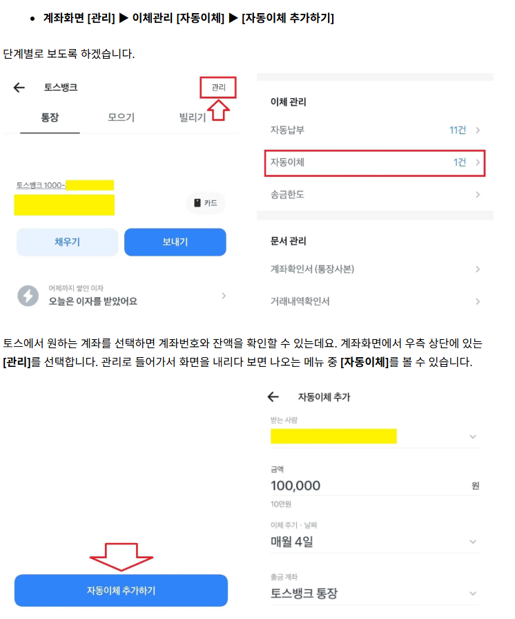 - 토스뱅크 계좌 외에도 연결된 다른 은행 계좌도 자동이체 가능합니다.