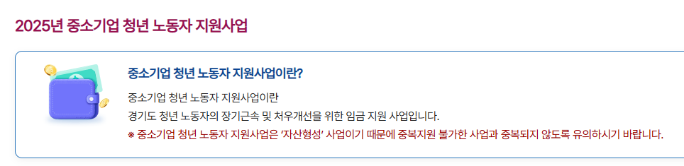 중소기업 청년 노동자 지원사업은 "자산형성 목적"으로 운영되는 만큼, 다른 유사한 지원사업과 중복 참여가 불가합니다.