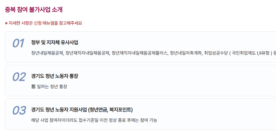 단, 해당 사업은 "자산형성 지원사업"으로 분류되며, 유사한 자산형성 목적의 청년 지원사업과는 중복 참여가 제한됩니다.