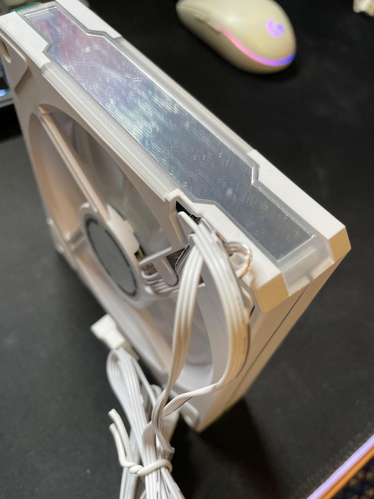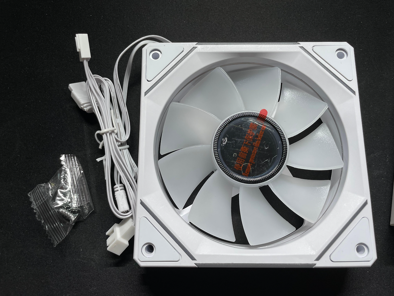 팬의 모습입니다. 제가 구매한 모델은 역방향 모델로 화이트 색상입니다. 측면 인피니티 미러 지원하고 팬 중앙부에도 동일하게 적용됩니다. 기본적으로 스크류 4개를 제공하는데 이 스크류가 팬과 체결될 때 상당히 뻑뻑하게 체결됩니다.