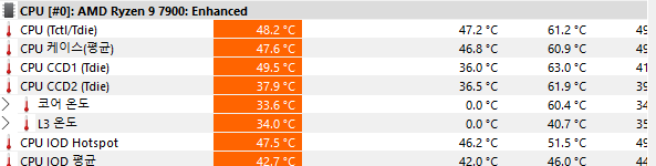 컨디션(?)이 좋을 때는 45도 까지도 내려가는 모습도 볼 수 있었습니다. (기본적인 온도가 조금은 높은 편인데 평소 온도가 아주 착하다고 알려진 라이젠 7 7900을 사용하지만 PBO 세팅과 전력을 손 봤기때문에 아이들 상태가 조금 높습니다.)