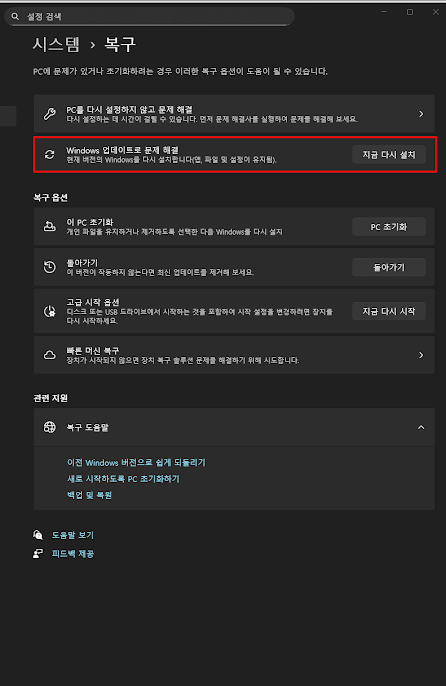 3. [ Windows 업데이트로 문제해결] 에서 [지금 다시 설치]를 누르고 기다리면 끝이다.